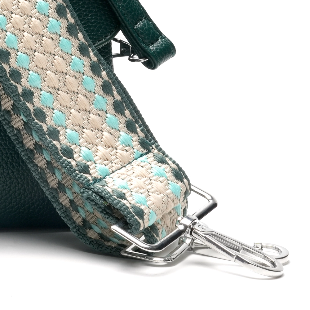Realizzata in pelle vegana di alta qualità, questa borsa include una sottile tracolla in eco pelle e una tracolla larga in tessuto 5 cm che si abbina al colore della borsa. Tutti gli elementi metallici sulla borsa e sulla tracolla sono di colore argento.