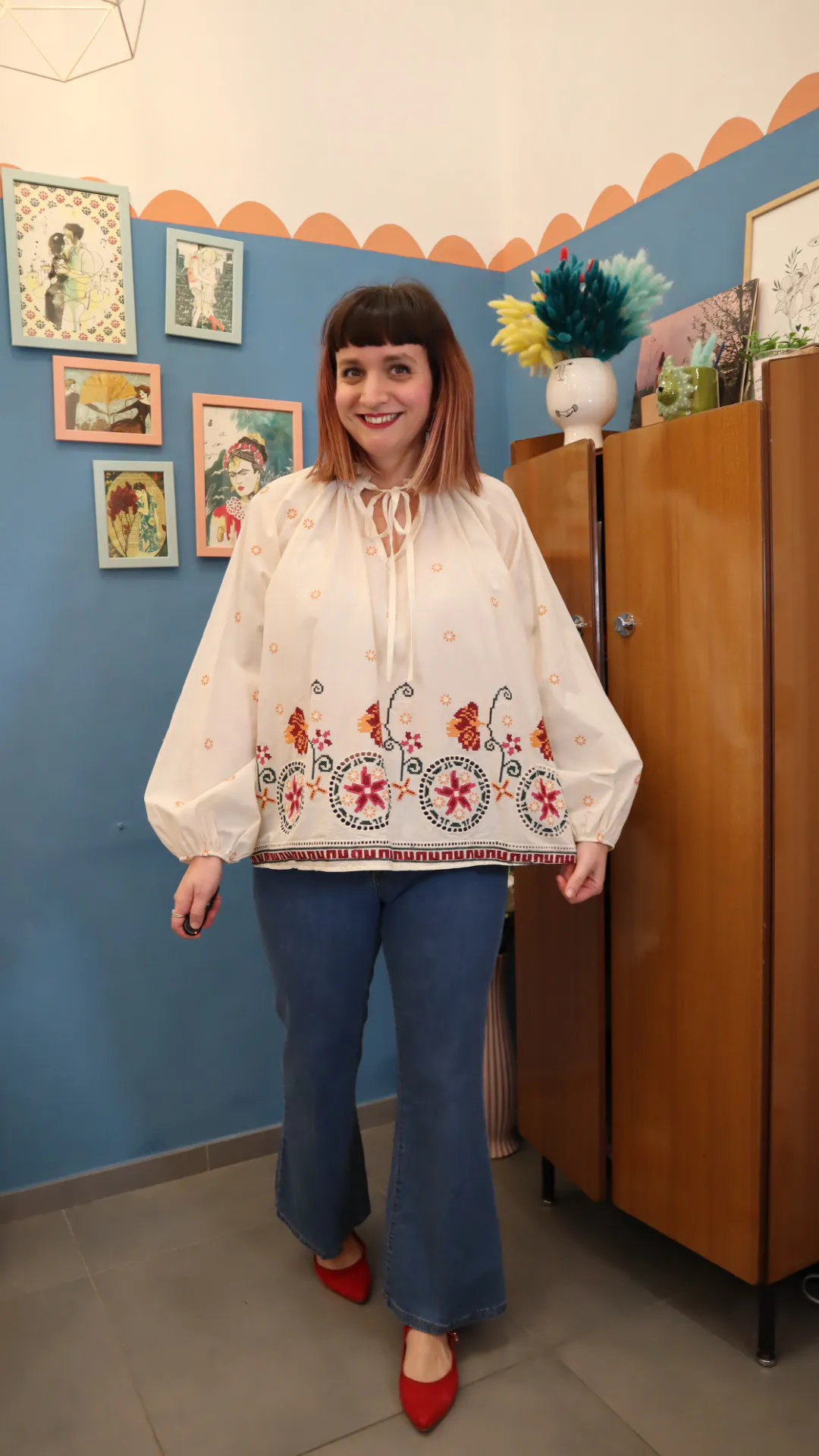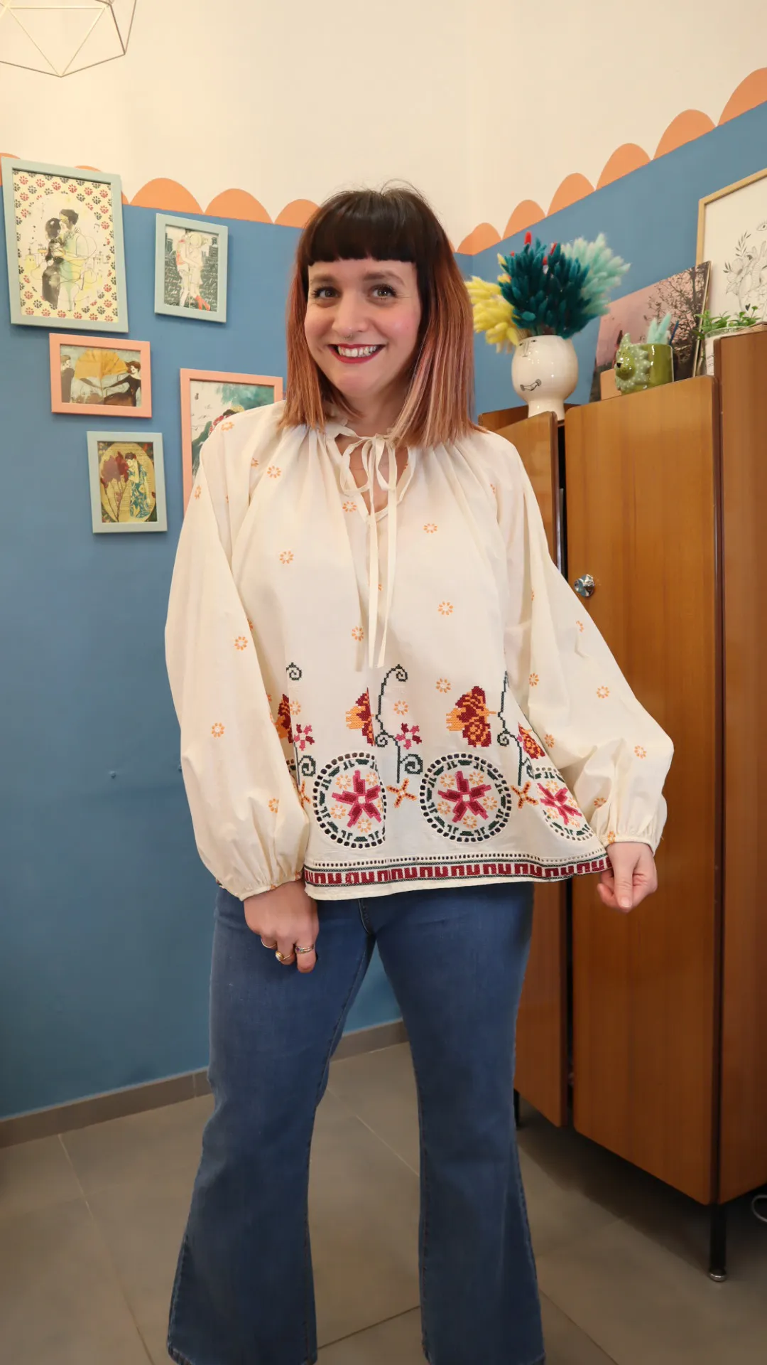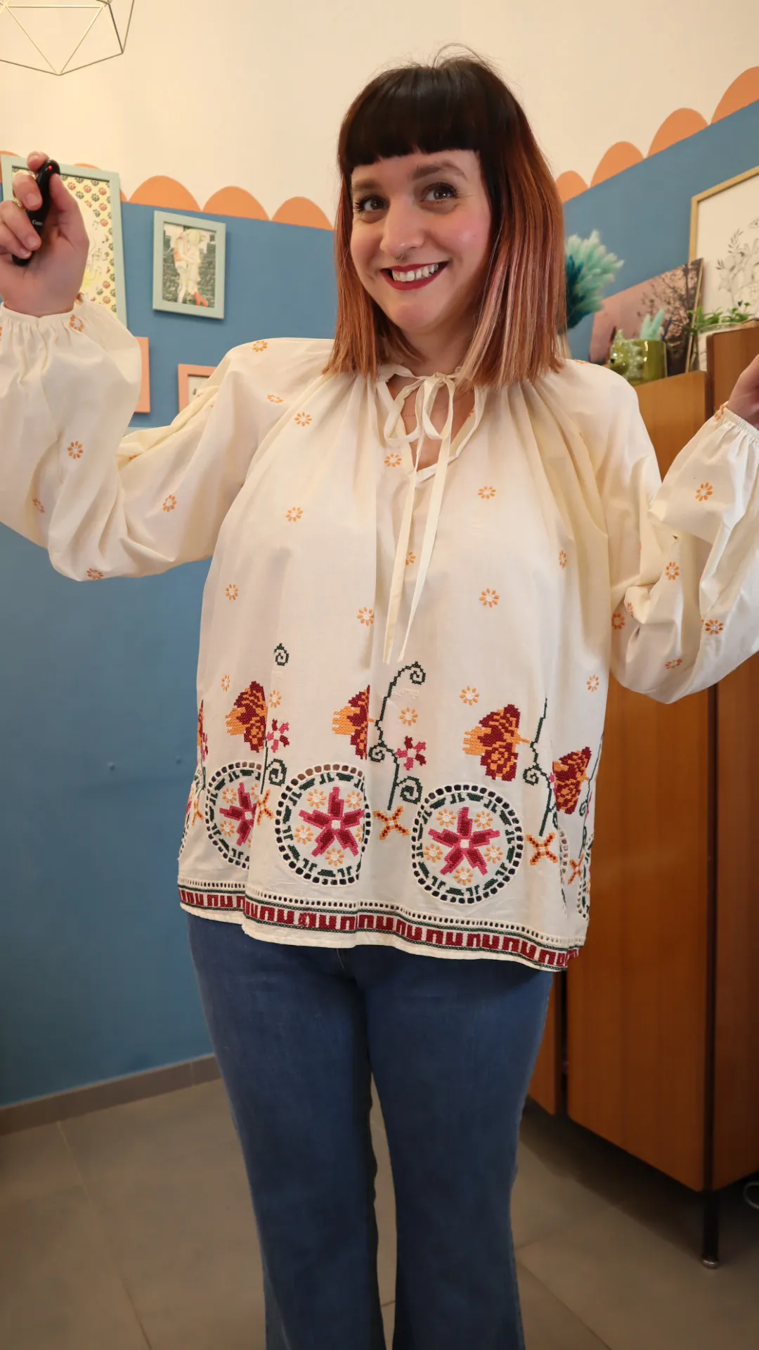 Camicia in 80% cotone 20% poliestre. Colletto con coulisse, dettagli ricamati