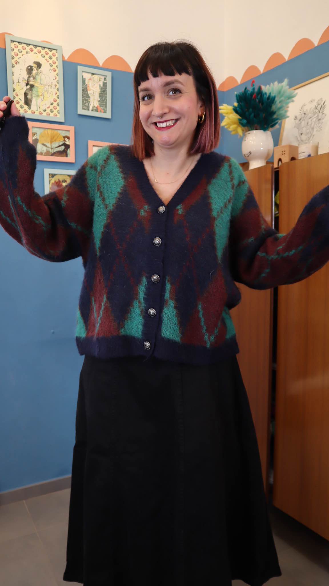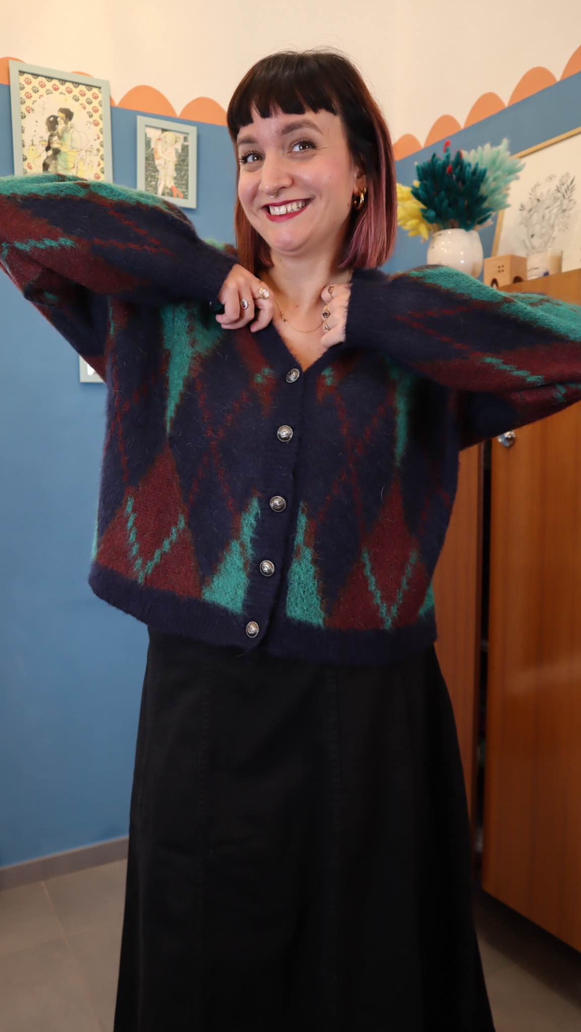Cardigan in acrilico con 10% lana 10% mohair.Scollo a v, bottoni in metallo