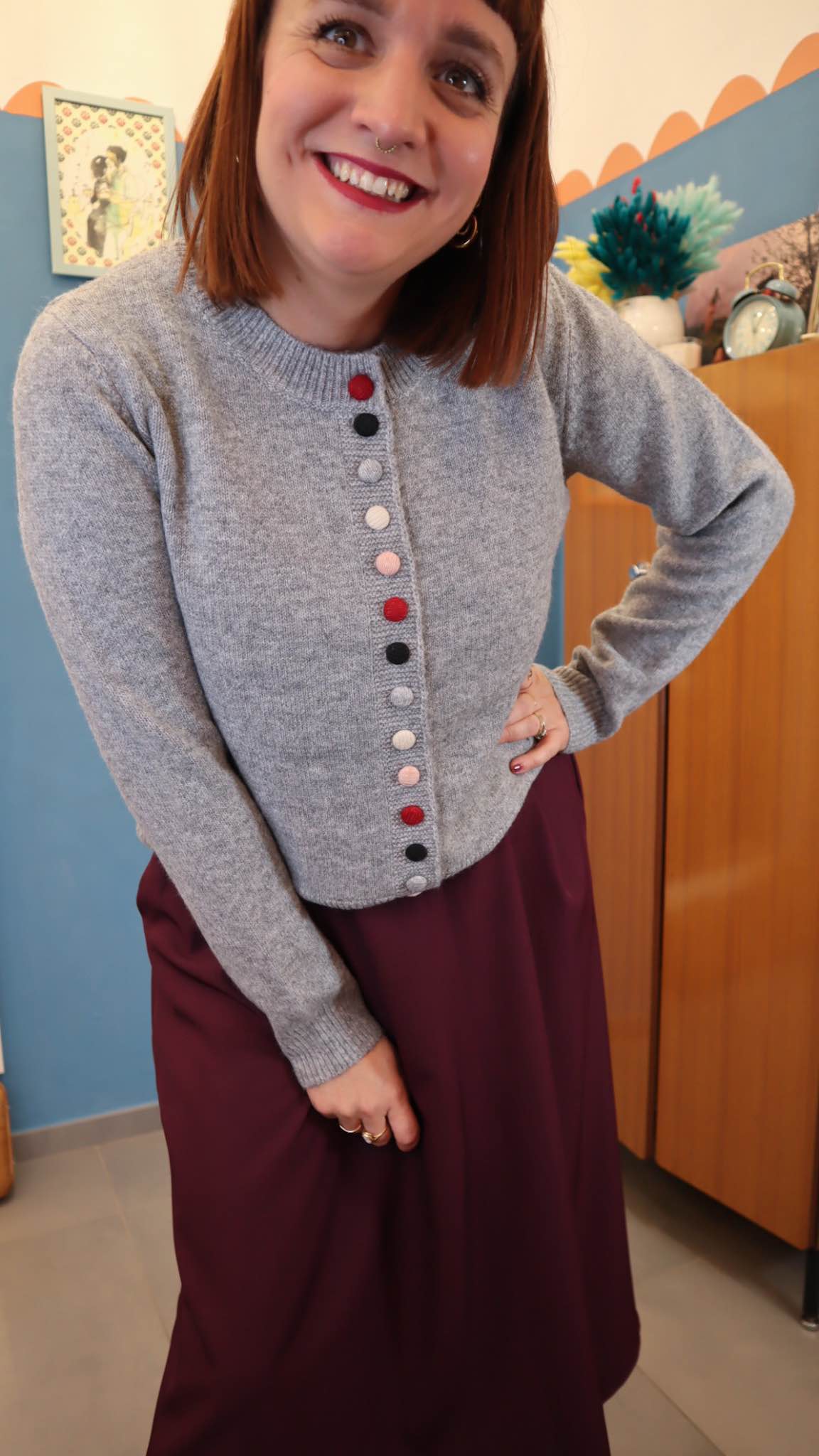 Cardigan in poliestere riciclato con 6%di lana. Bottoni colorati