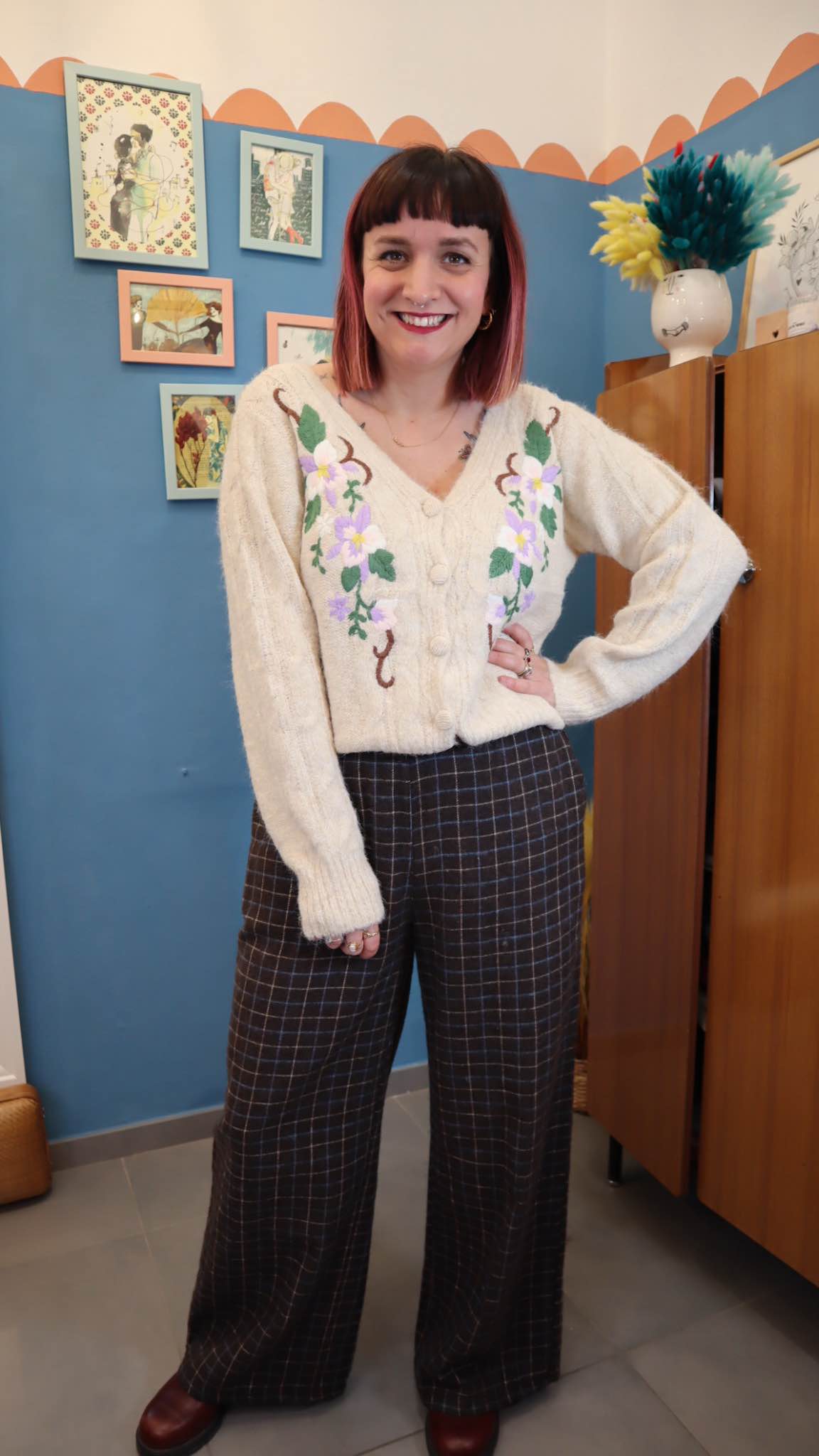 Cardigan in poliestere misto viscosa con 8% lana. Scollo a V con dettagli ricamati