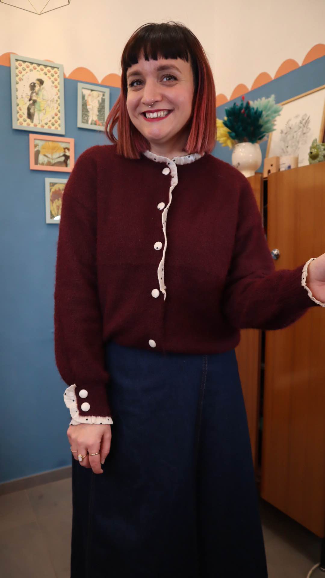 Cardigan in 68% poliestere riciclato 10% lana 20% poliestere 2% spadex.Polsini e colletto con tessuto a contrasto