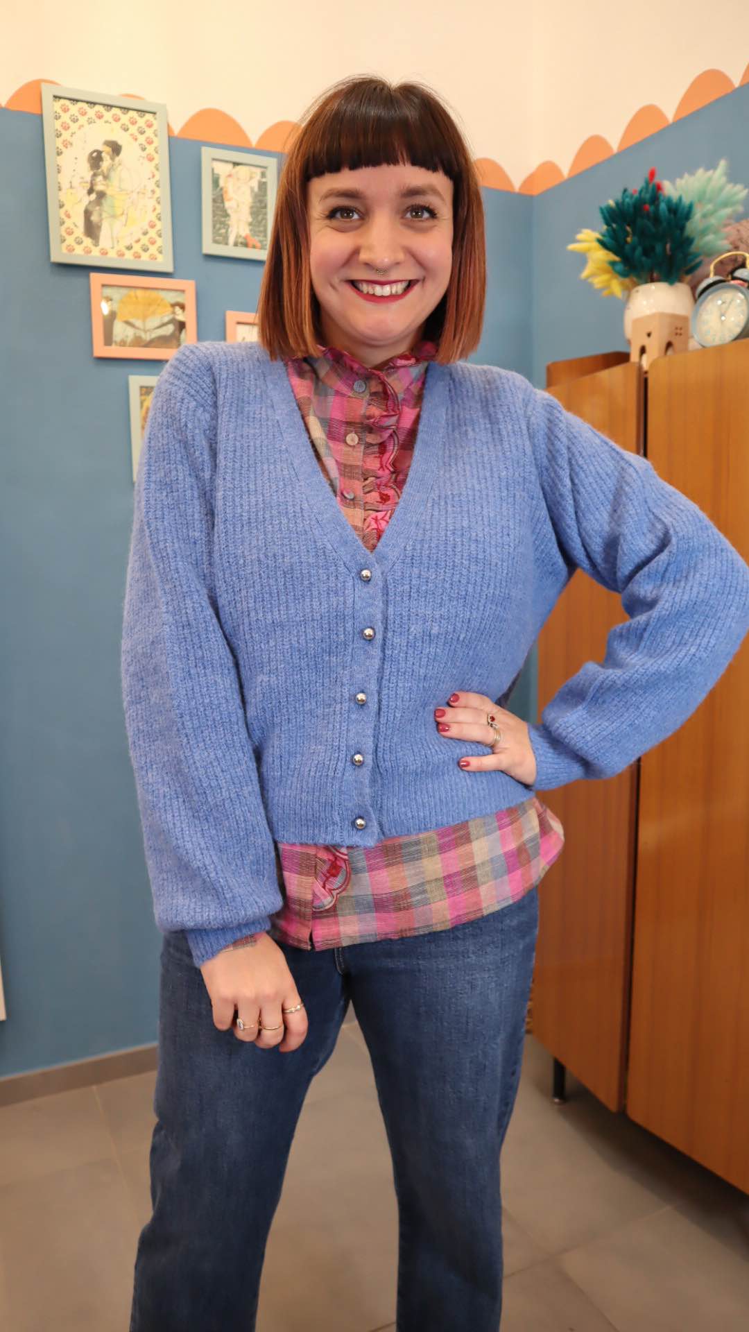 Cardigan in acrilico con 8% lana 6%alpaca. Scollo a v con bottoni metallici. Manica ampia