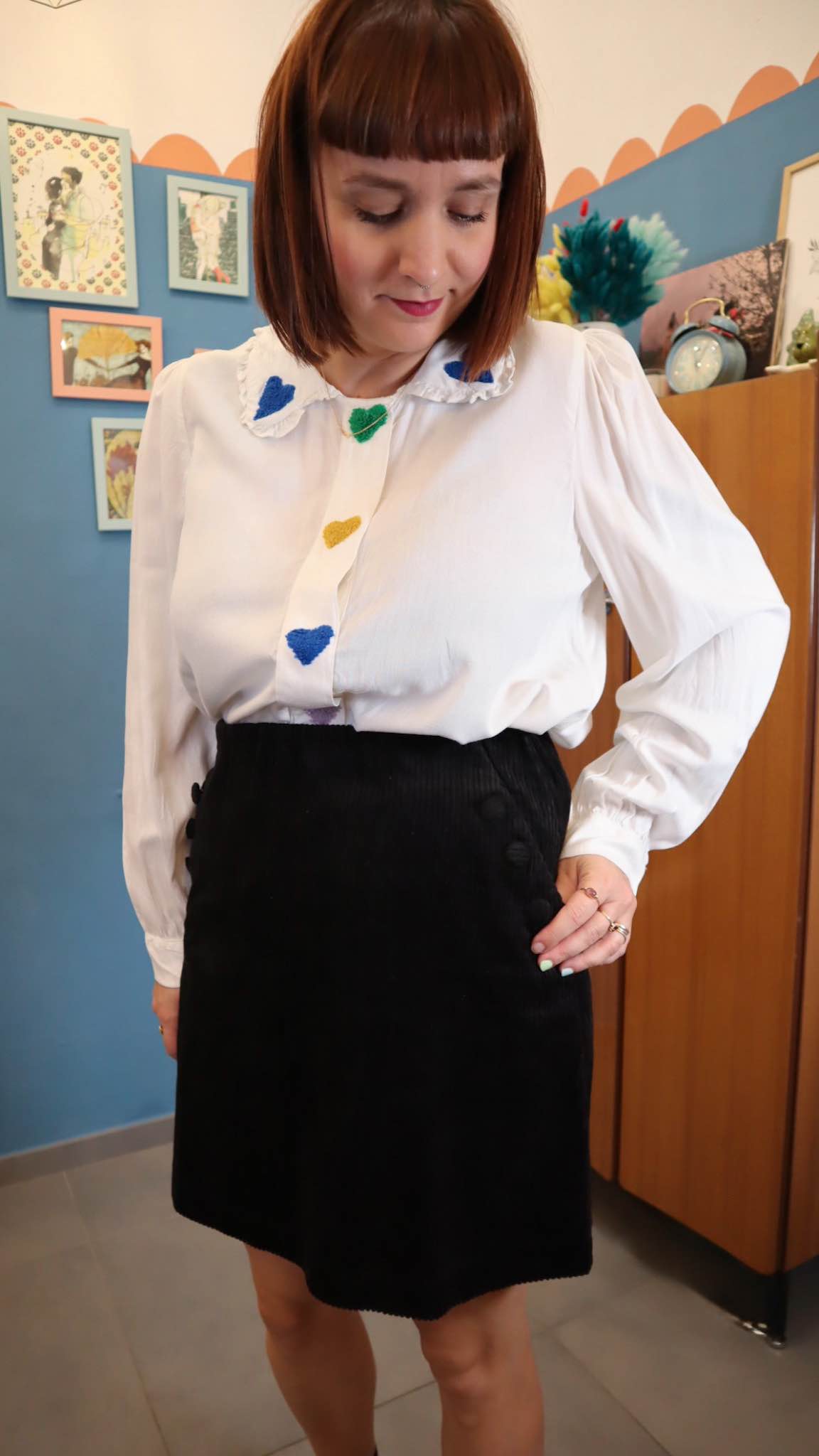 Gonna in velluto costa inglese.Tasche laterali con bottoncini. Elastico in vita interno