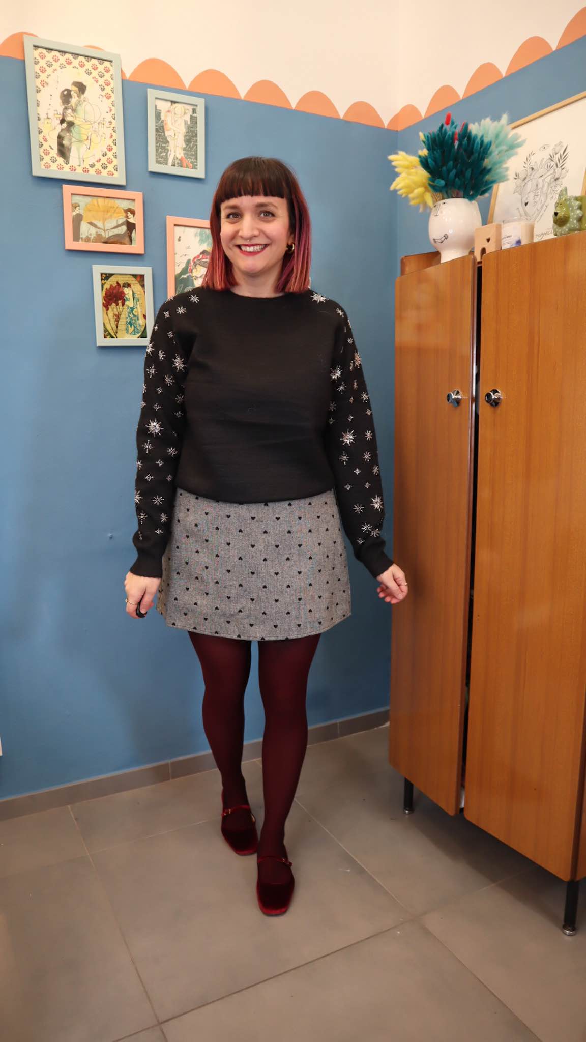 Maglione in poliestere riciclato 12% lana 8% viscosa. Dettaglio perline nelle maniche