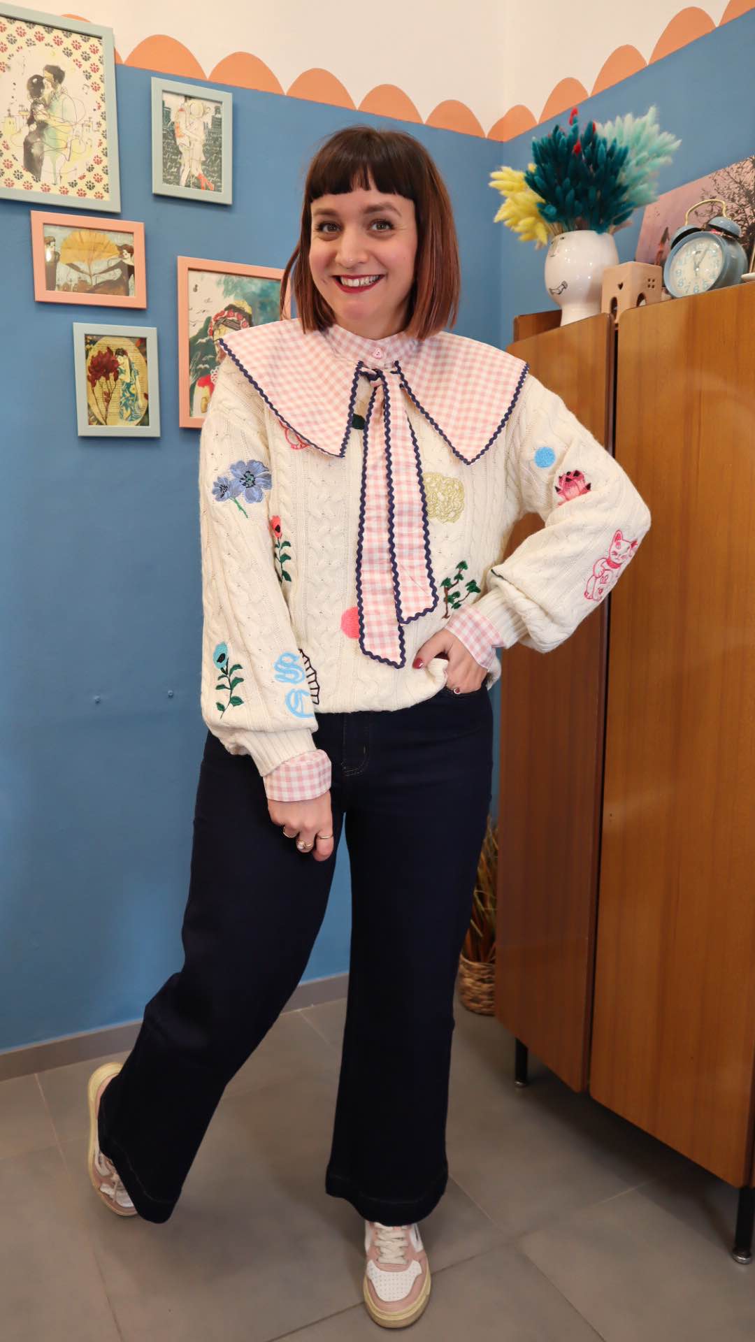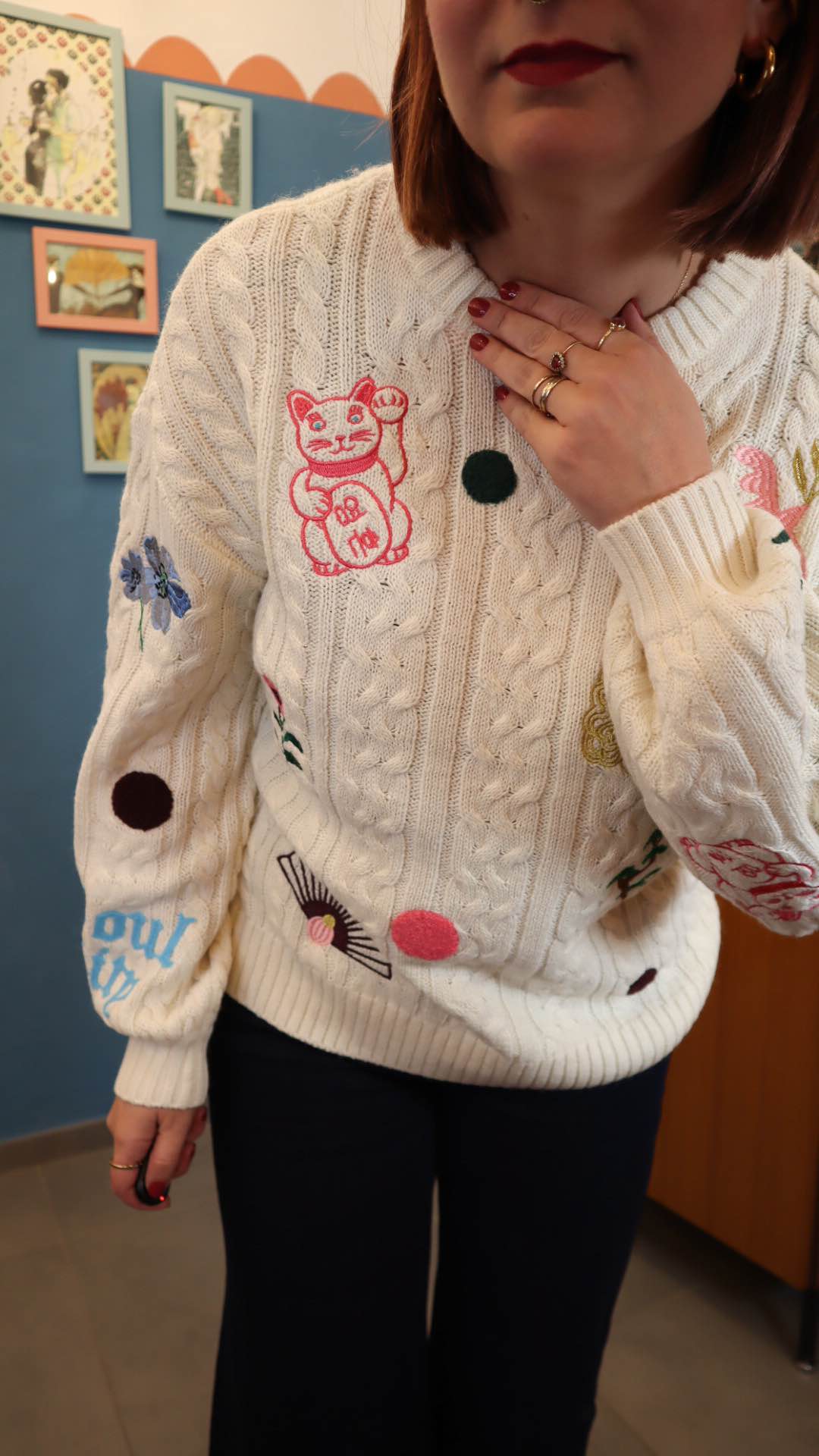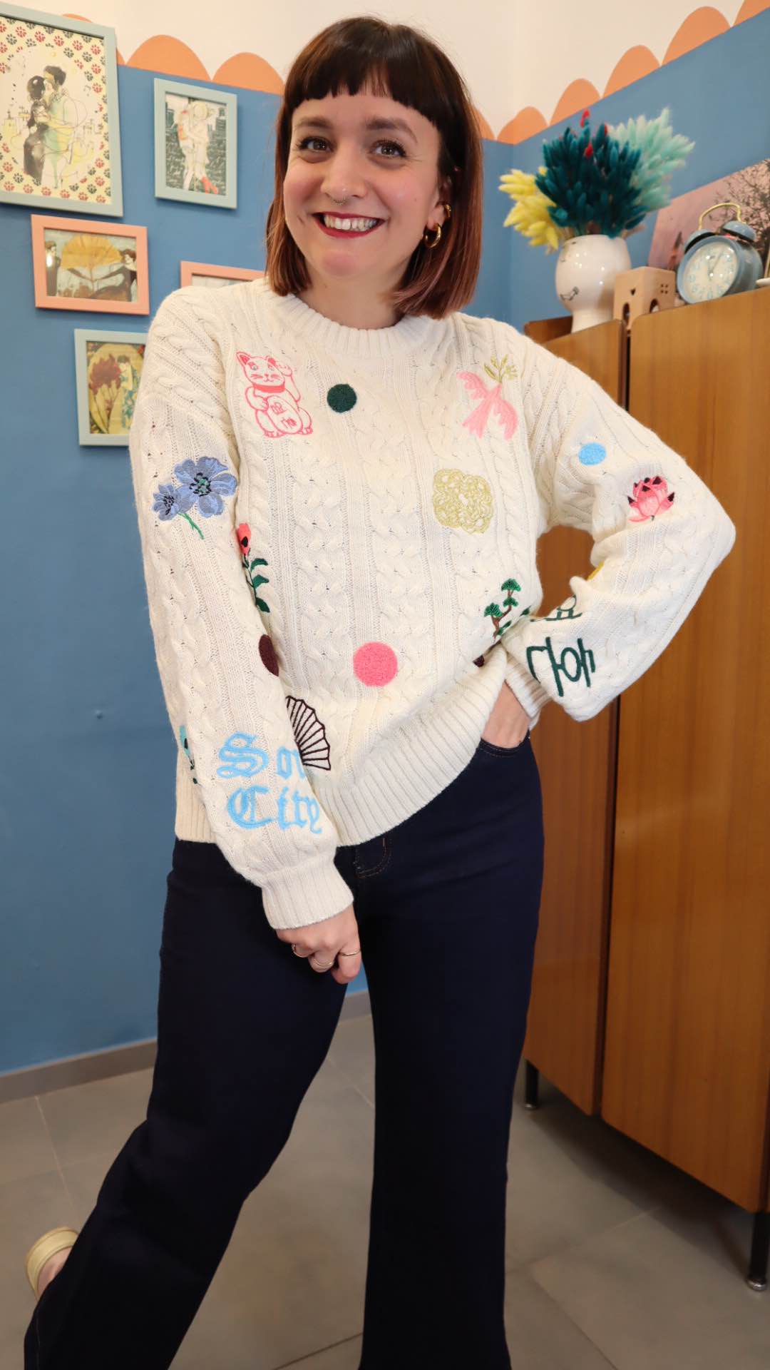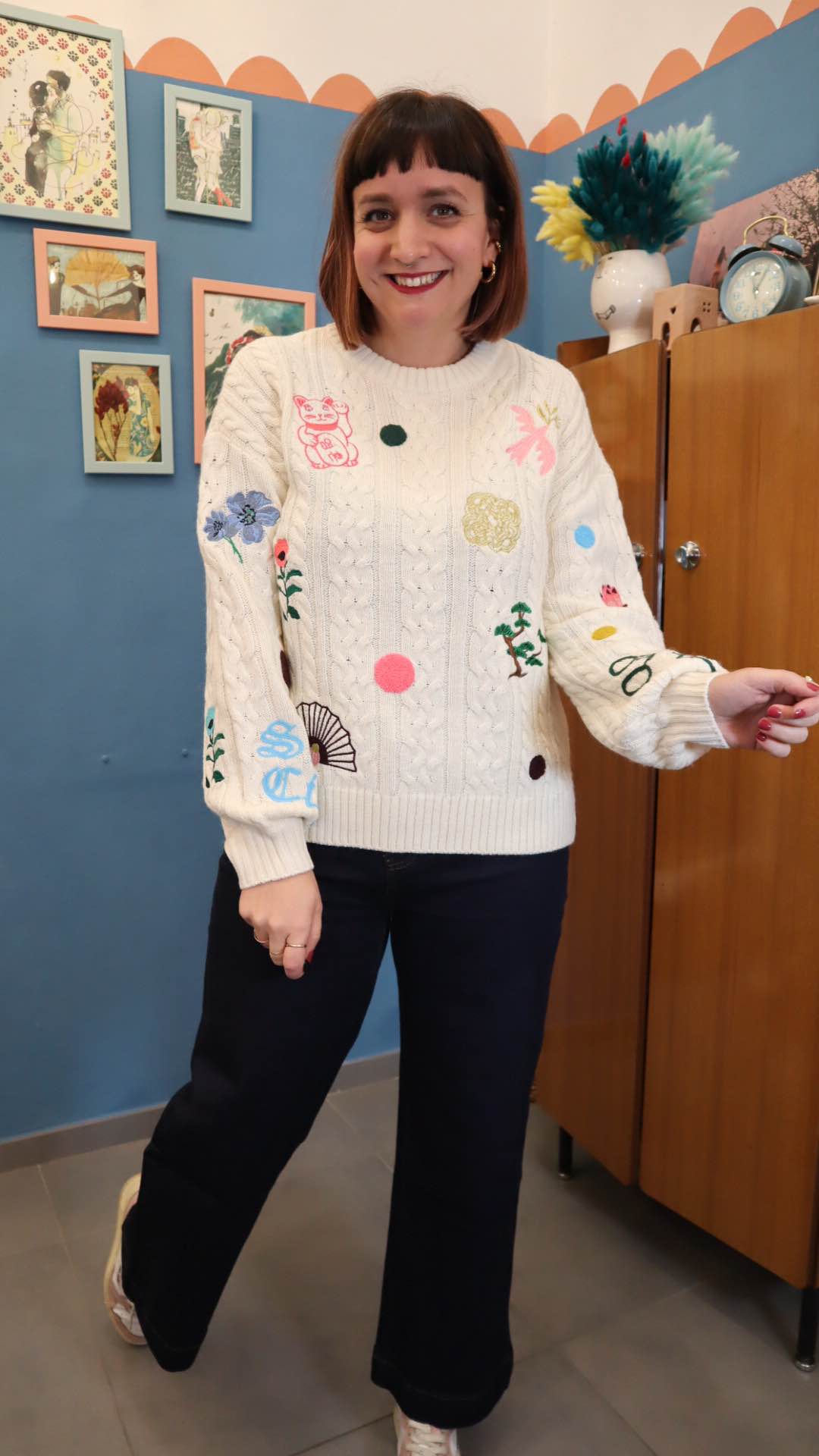 Maglione in 48% cotone 10% lana 42% acrilico. Vestibilitร Oversize. Dettagli ricamati