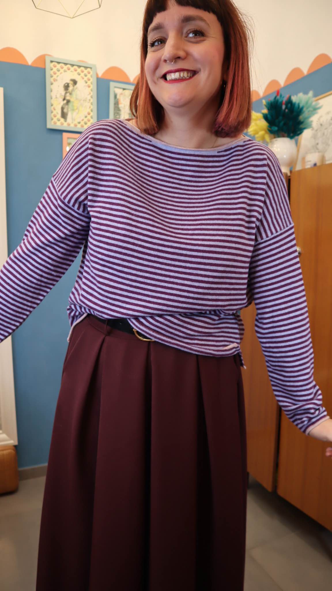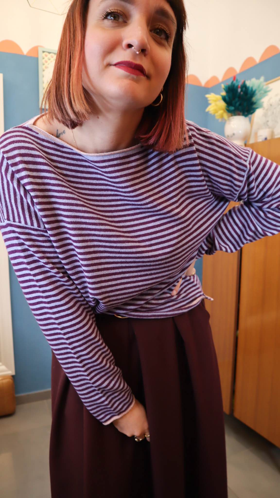 Maglione 30% lana 5% cashmere 35% viscosa 30% poliammide. Scollo a barca, modello boxy